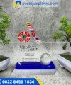 Lebih lanjut, kami sangat memperhatikan estetika pada bagian dudukan atau alas penyangga plakat ini. Oleh sebab itu, kami memadukan akrilik bening tebal dengan lapisan akrilik biru transparan yang sangat cantik. Berikut adalah rincian spesifikasi material dari plakat internasional ini: